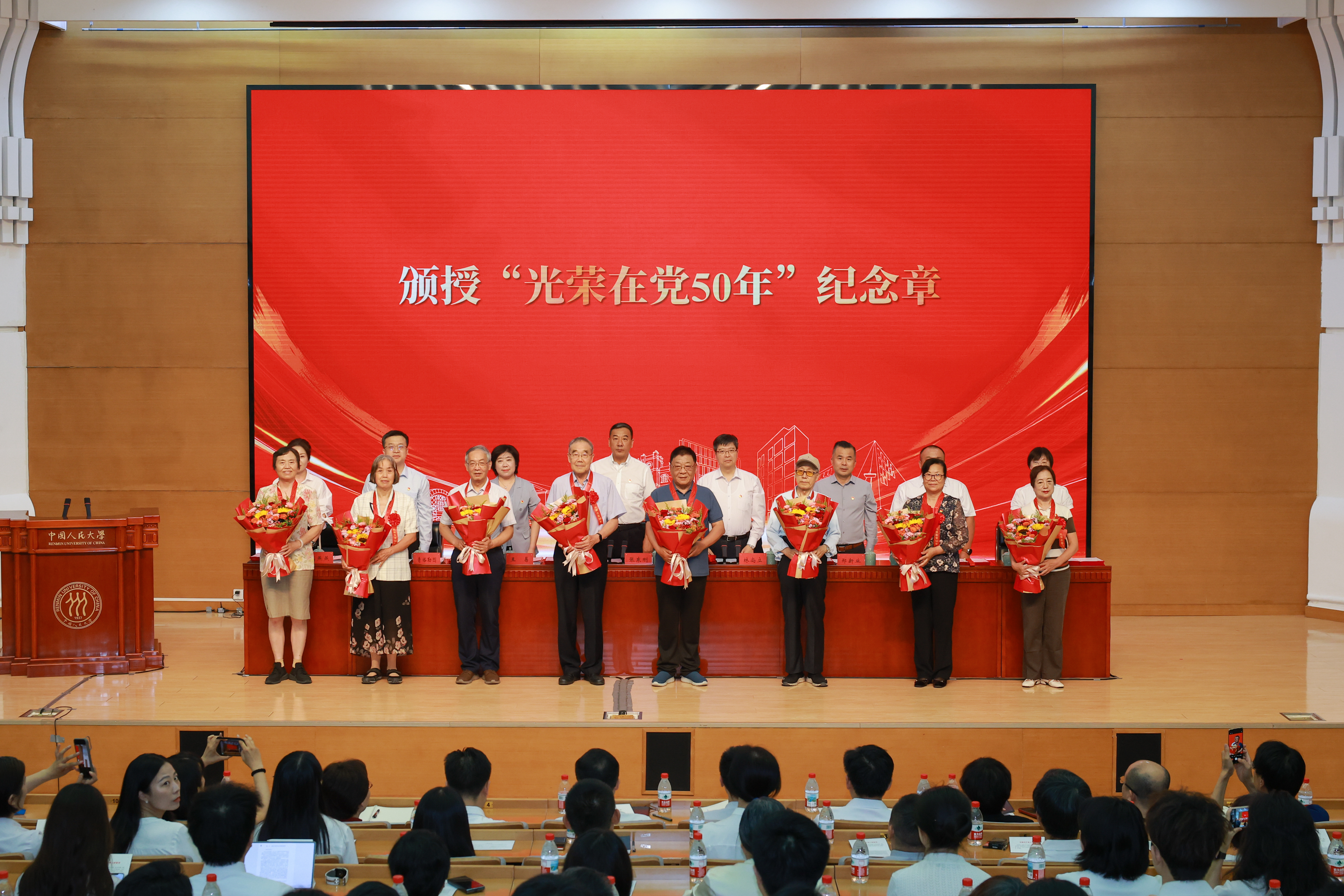 袁卫同志上台领取“光荣在党50年”纪念章(前排左四)