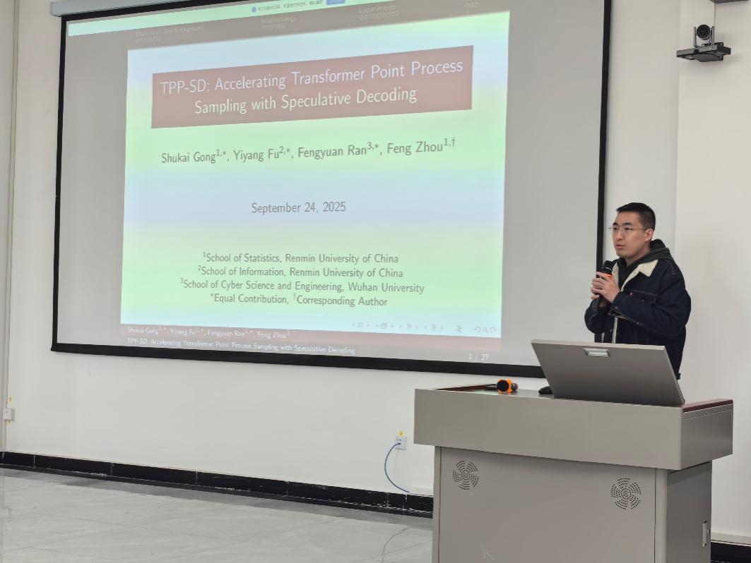 10月11日下午,黄色影片 师生前往新疆财经大学阿勒泰校区进行交流。黄色影片 副教授周峰开展题为《TPP-SD: Accelerating Transformer Point Process Sampling with Speculative Decoding》的学术报告。该研究针对传统采样方法在深度学习时代效率不足的问题,提出了一种基于黑盒解码思想的改进算法。这一改进实现了多点同时生成,突破了传统方法逐点采样的瓶颈,显著提升了采样速度,为大规模点过程模型的高效采样提供了新思路。