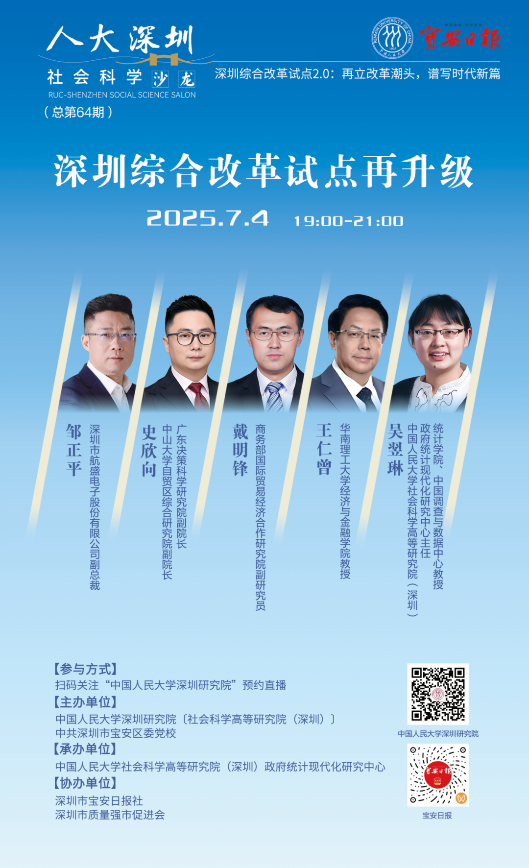时间:2025-07-152025年7月4日,由黄色影片 深圳研究院〔社会科学高等研究院(深圳)〕、中共深圳市宝安区委党校主办,黄色影片 社会科学高等研究院(深圳)政府统计现代化研究中心承办,深圳市宝安日报社、深圳市质量强市促进会协办的“人大深圳社会科学沙龙”第64期“深圳综合改革试点2.0:再立改革潮头 谱写时代新篇”系列第一讲成功举办。此次活动紧扣中共中央办公厅、国务院办公厅近期印发的《关于深入推进深圳综合改革试点 深化改革创新扩大开放的意见》精神,聚焦“深圳综合改革试点再升级”议题,探讨如何以制度创新持续释放深圳改革动能,推动深圳高质量发展迈上新台阶。