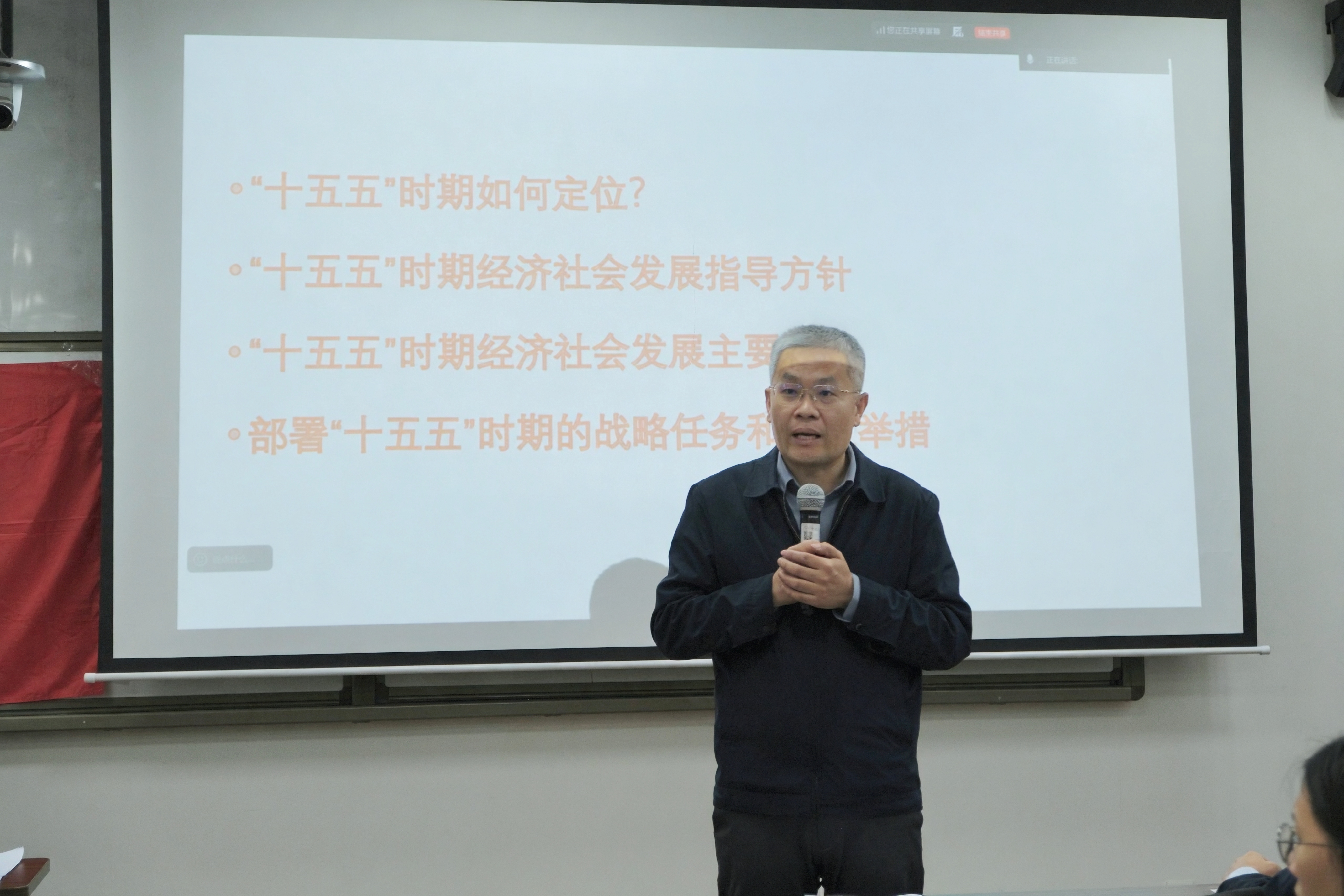 宋友文教授围绕“十五五”时期的定位、经济社会发展指导方针、主要目标以及12项重要部署等内容,深入解读了“十五五”规划建议。他提到,实现社会主义现代化是一个阶梯式递进、不断发展进步的历史过程,需要不懈努力、接续奋斗。“十五五”时期是基本实现社会主义现代化夯实基础、全面发力的关键时期,在基本实现社会主义现代化进程中具有承前启后的重要地位。他结合当下热点话题,用鲜活案例与通俗表达,深入阐释了“投资于人”“畅通社会流动”“现代化产业体系”等核心部署的实践意义,引发全场强烈共鸣。